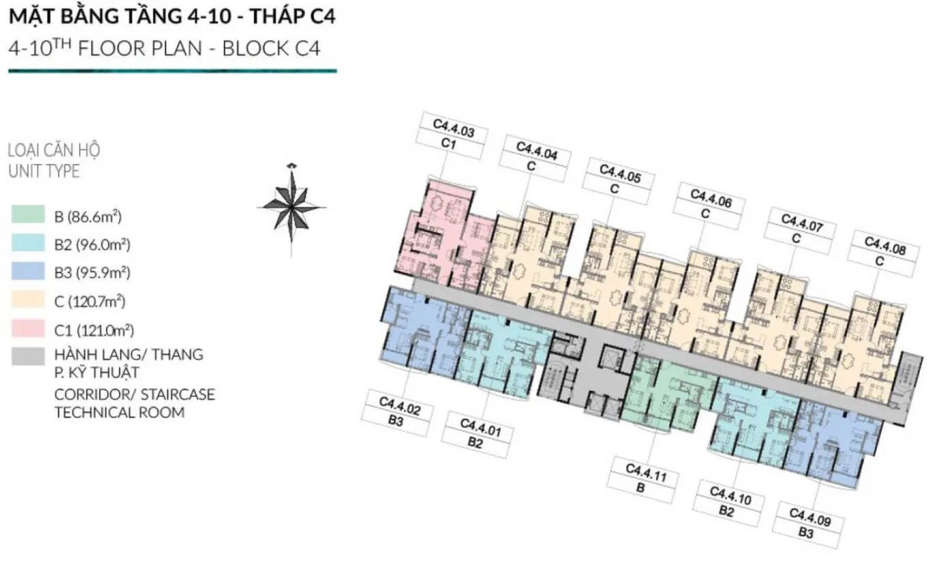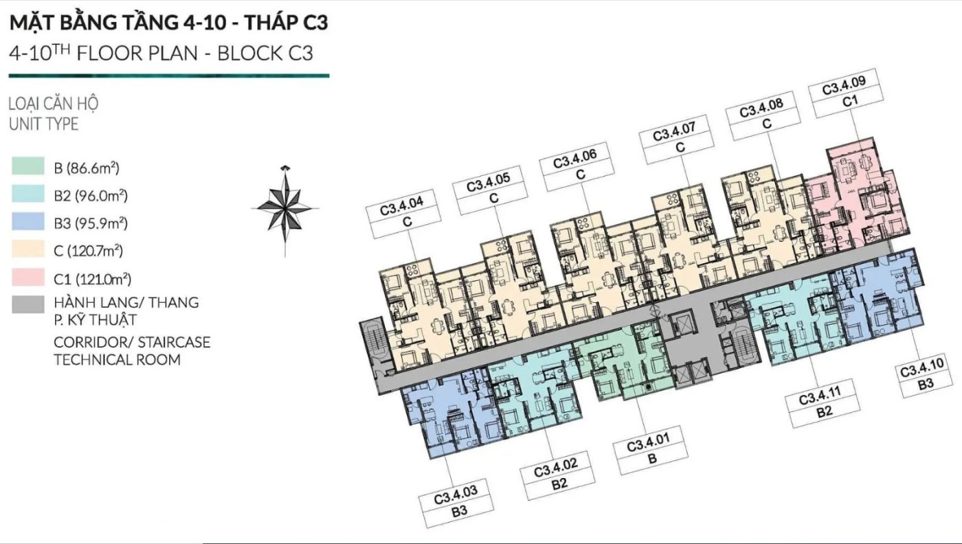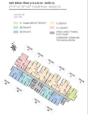 Dự án gồm 6 tháp căn hộ C1 – C6, bố trí thông minh giúp mọi căn hộ đều có tầm nhìn thoáng rộng hướng công viên hoặc hồ bơi trung tâm.