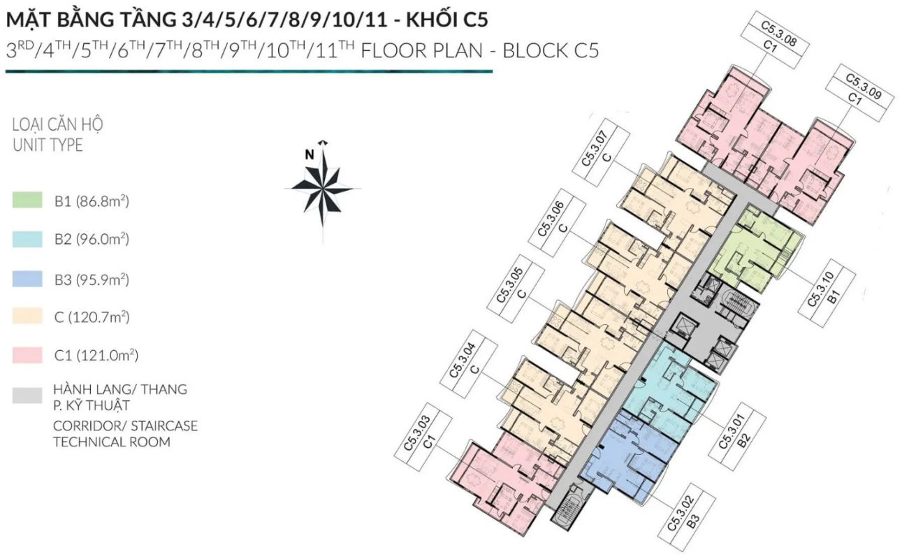 - Quy mô: 6 tháp căn hộ (C1 – C6), cao 13–14 tầng